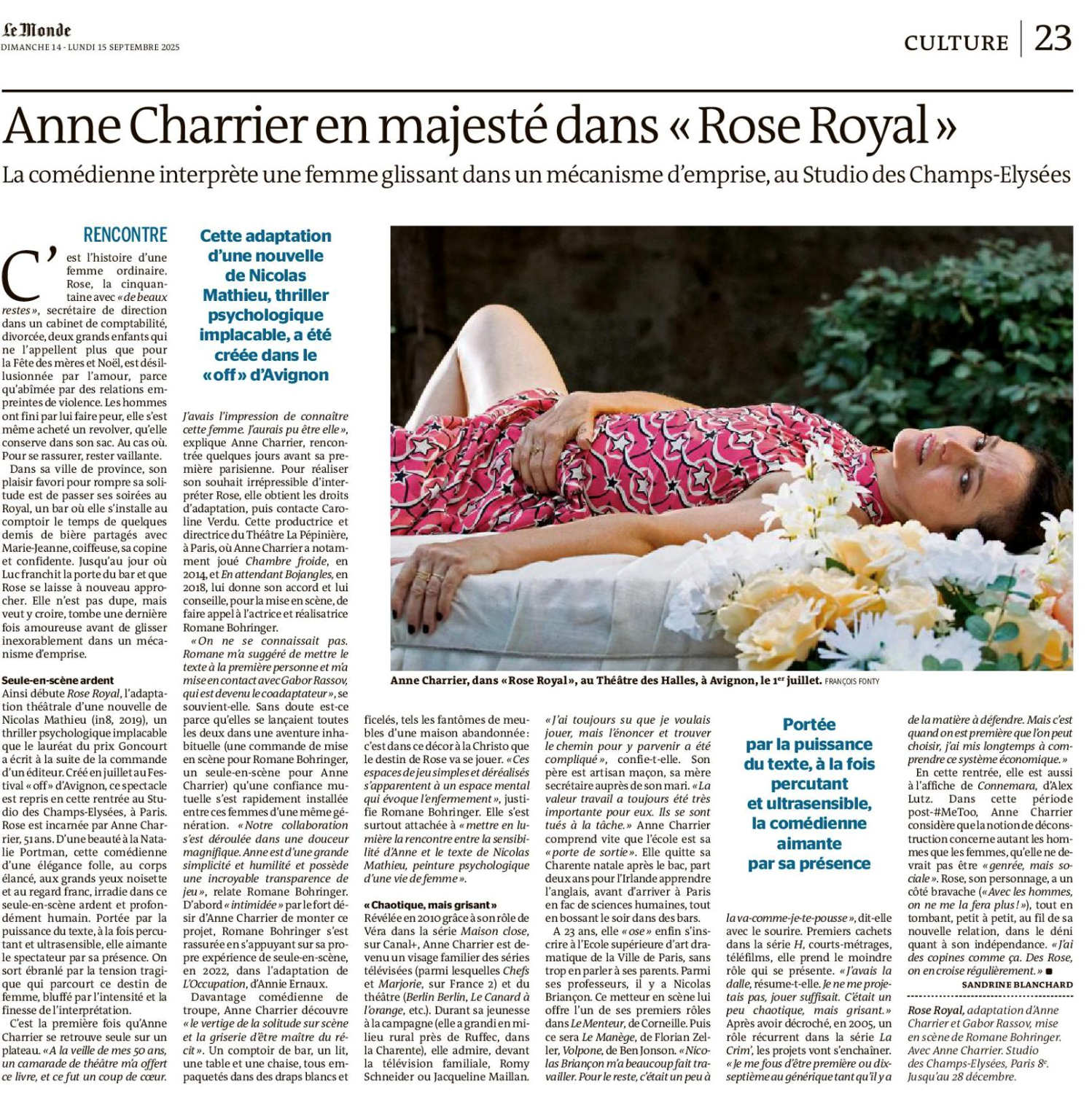 " Ardent et profondément humain... Bluffé " : Le monde "Implacable" : Télérama « Émeut, amuse et affole » : Le nouvel Obs « Une comédienne au Zénith » : Le Parisien « Fatale attraction » : Théâtral Magazine « Anne Charrier irradie » : L’Oeil d’Olivier